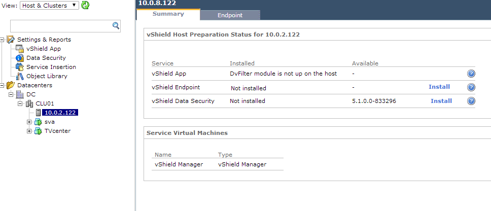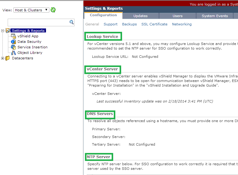 After Login we need to perform basic setttings. Go to >Setting and report>Configration. Configure the Lookup service URL, Connect to vCenter, DNS, and NTP server. NTP server is mandatory during vShield Endpoint management.
