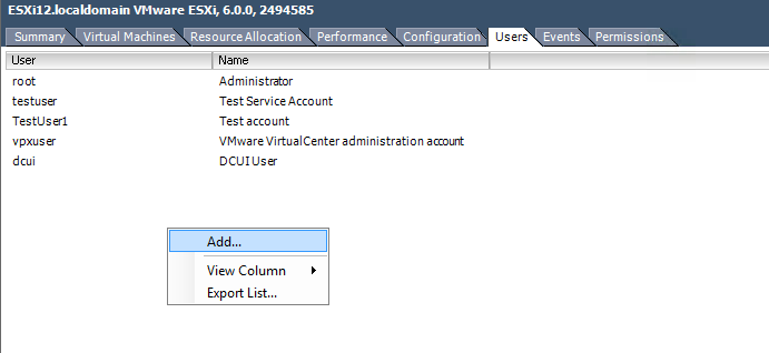 Login to ESXi host from the vsphere client and in Users tab we create new user