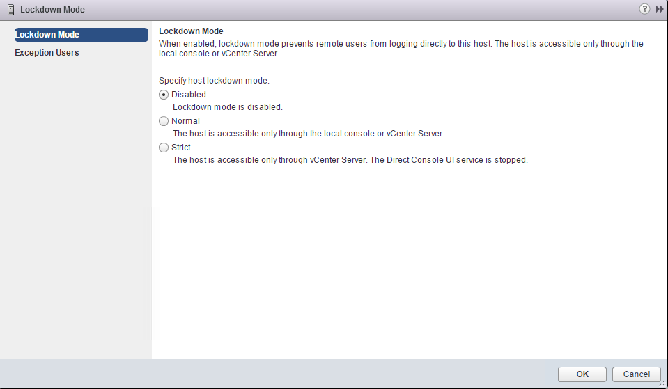 When using Normal mode, ESXi is only accessible through Local console or through vCenter. Only user through Exception list or DCUI.Access advanced option for the host can access the ESXi.