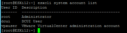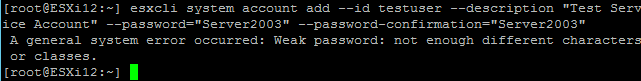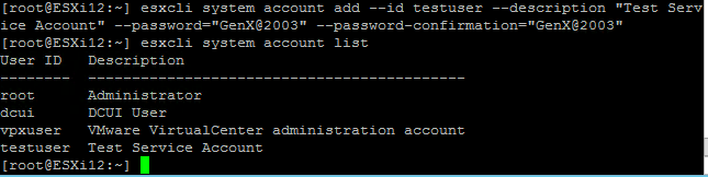 esxcli system account add –id testuser –description “Test Service Account” –password=”Server2003″ –password-confirmation=”Server2003″