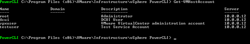 New-VMHostAccount -password GenX@2003 -Description “Test account” -useraccount TestUser1 // create user with User Name “TestUser1” and password “GenX@2003”